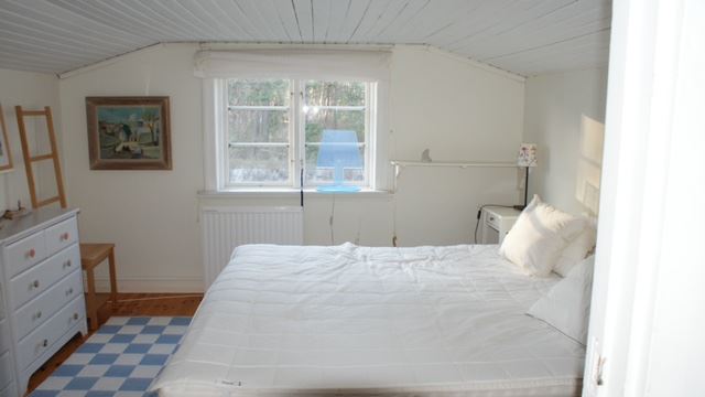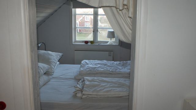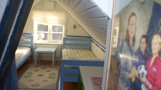 Die Zimmer im Obergeschoss verfügen über schräge Decken. Es gibt ein Schlafzimmer mit einem Doppelbett, ein weiteres Schlafzimmer mit 2 zusammengestellten Einzelbetten und ein kleineres Zimmer mit Stehhöhe in der Mitte und 2 Einzelbetten.