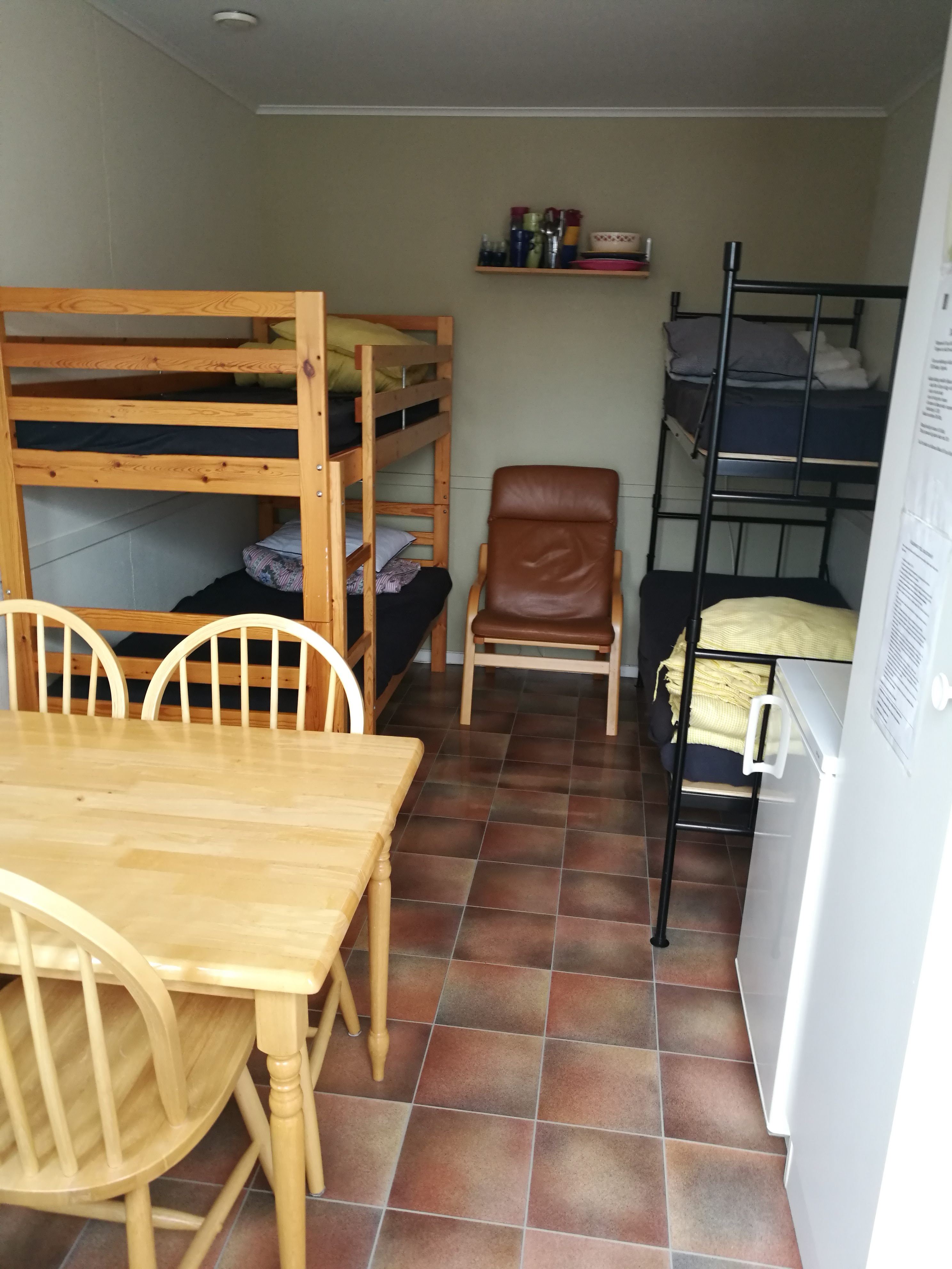 Klinten: Einstöckiges Ferienhaus mit Zimmer 7-11m2 mit Bett und Kühlschrank. Küche, Dusche/WC im Gemeinschaftsgebäude zwischen Fåken und Token.